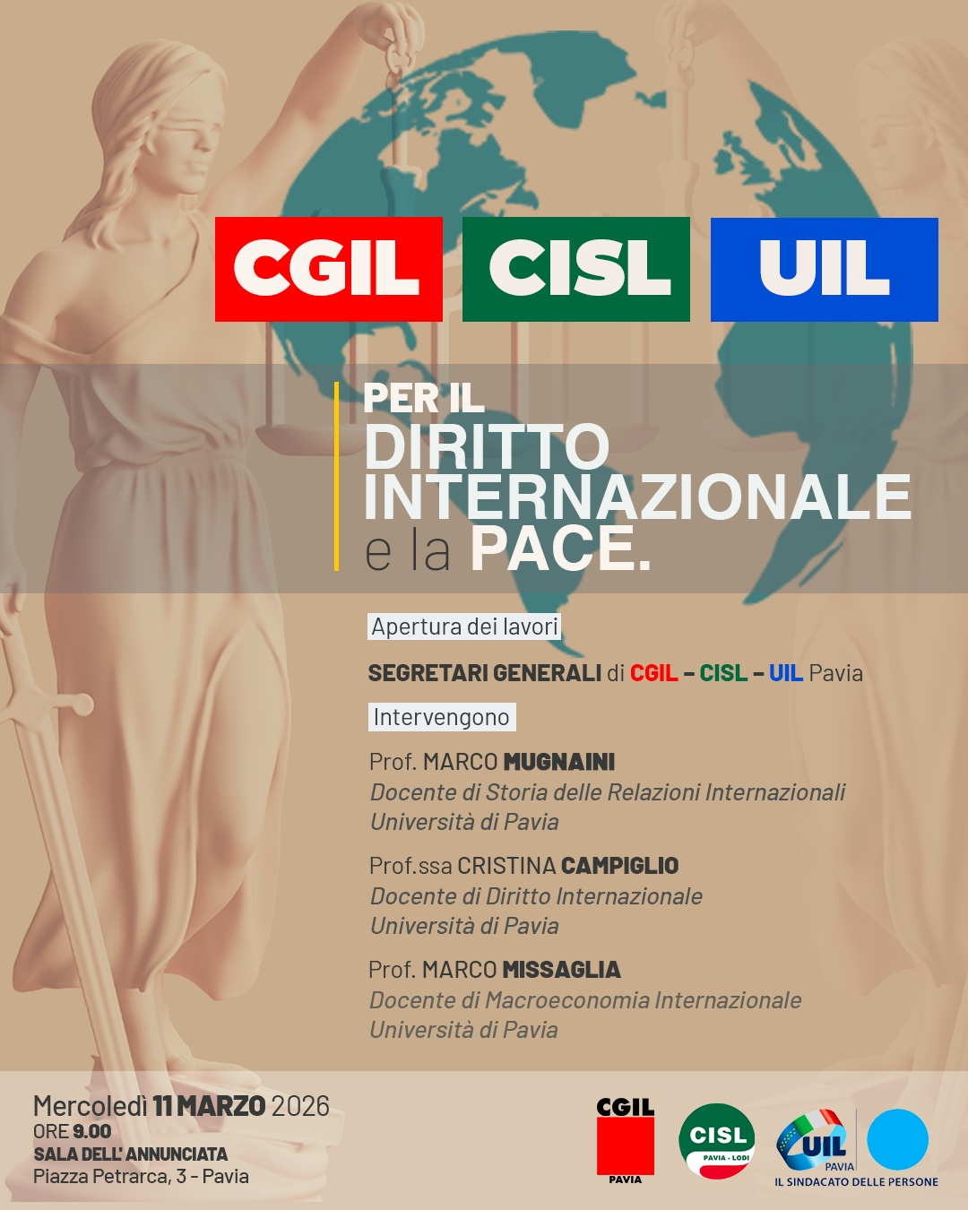 La Cisl Pavia Lodi, in stretta sinergia con CGIL e UIL, promuove un importante momento di riflessione e approfondimento dal titolo: “Per il Diritto Internazionale e la Pace”.